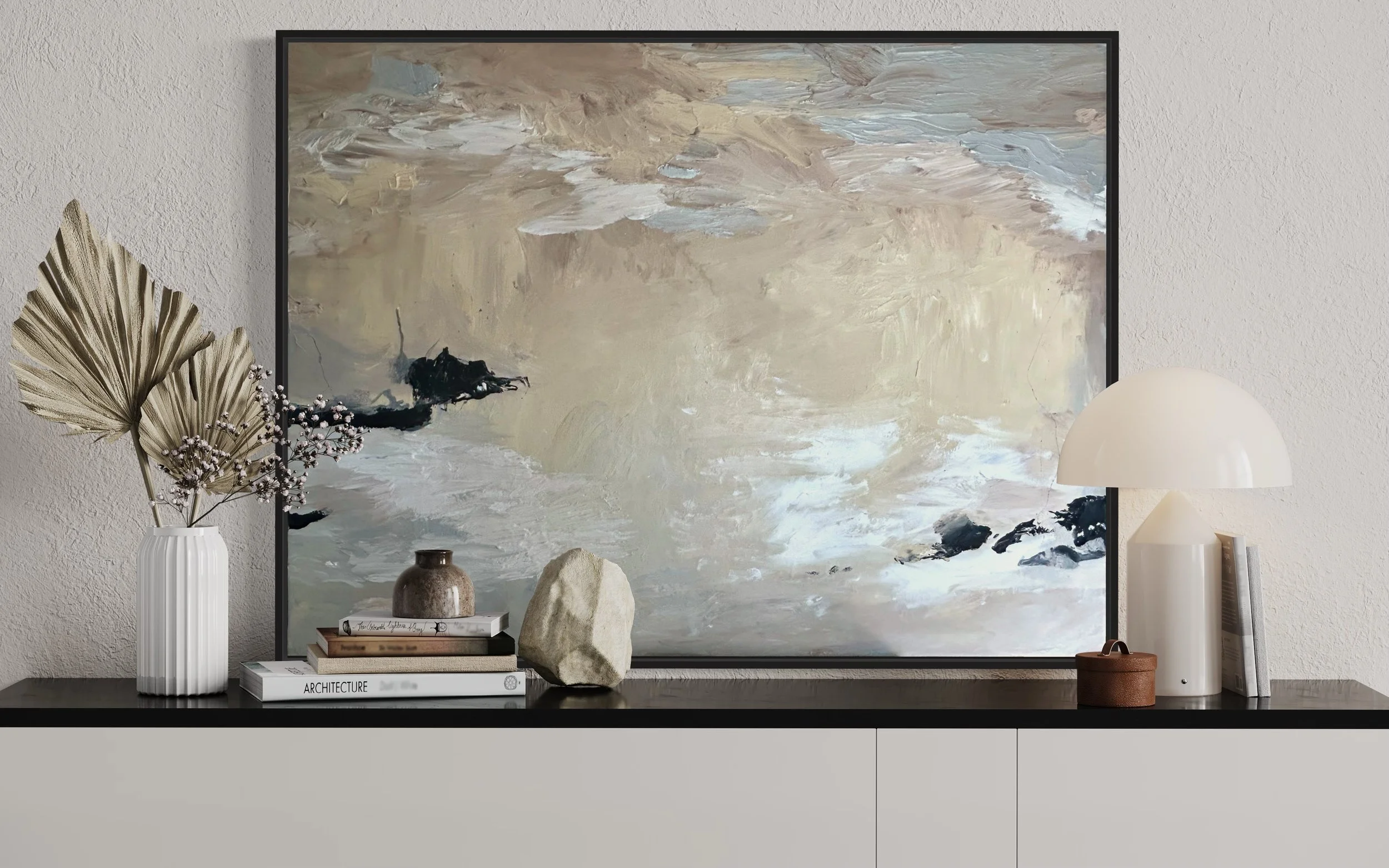 A neutral abstract painting in cream, beige and silver tones evoking a thawing stream in spring. Acrylic paint on 30x40 canvas