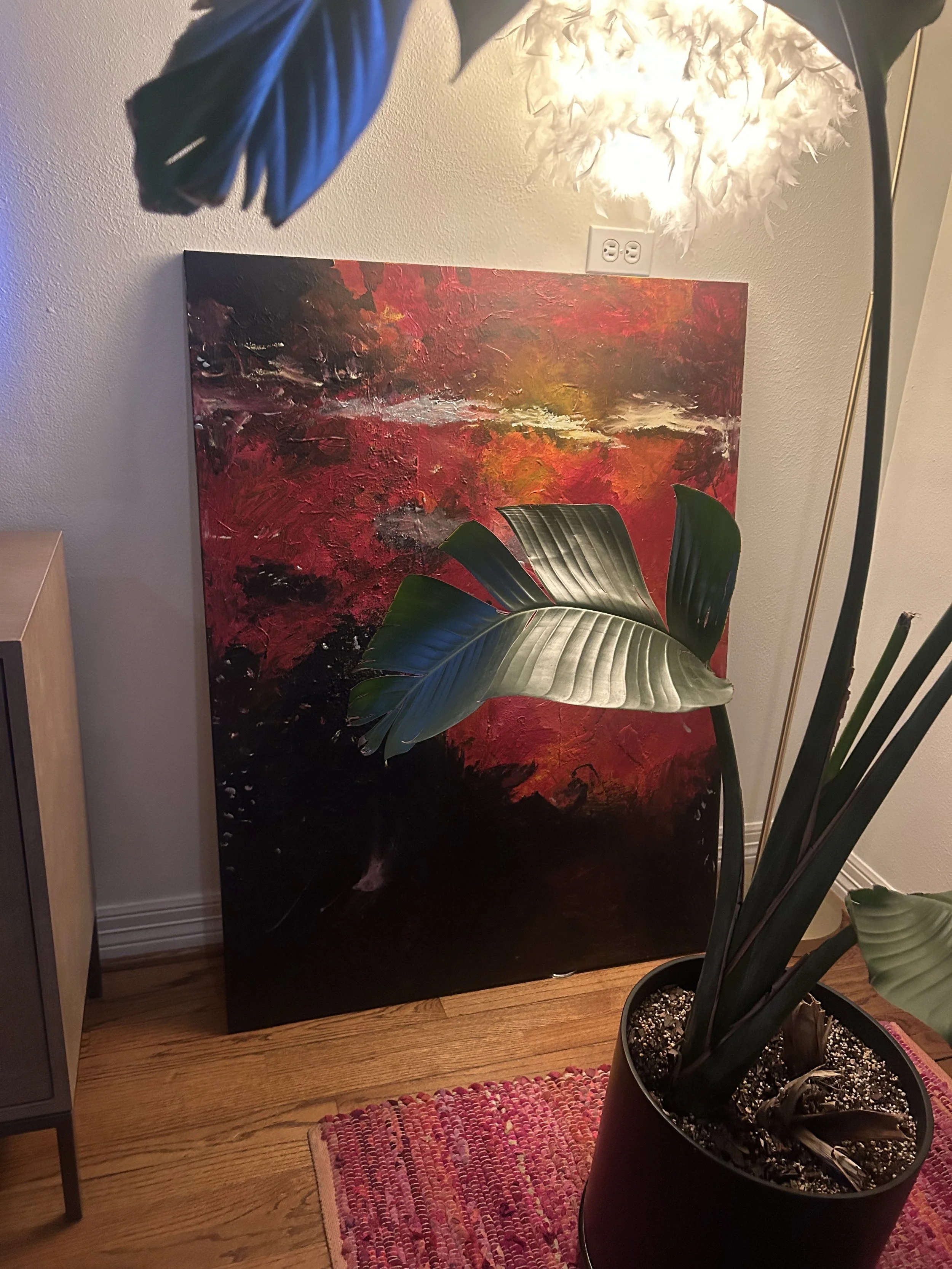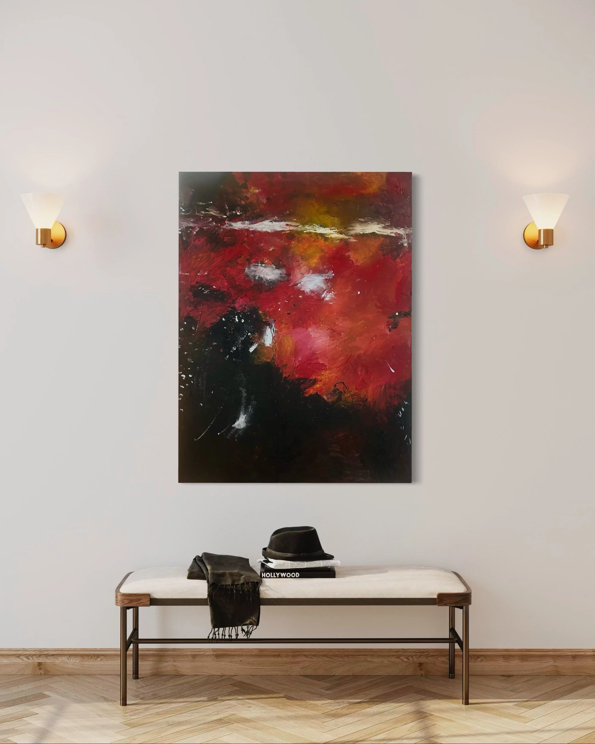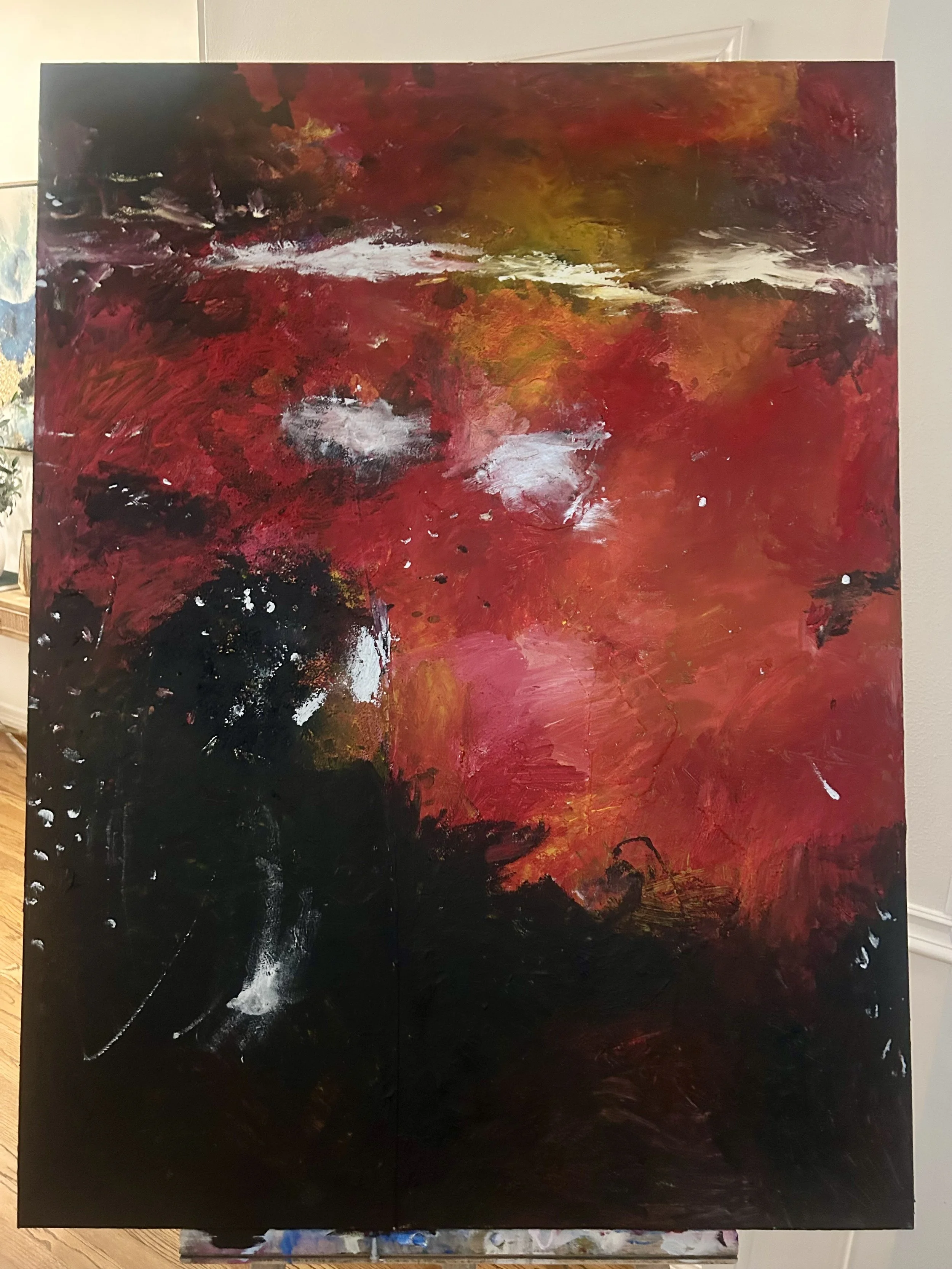 Inspired by Rothko, this painting has dramatic reds, oxblood, maroon and black tones with silver gray accents. Mixed media - acrylic and wax on 48×36’ canvas.